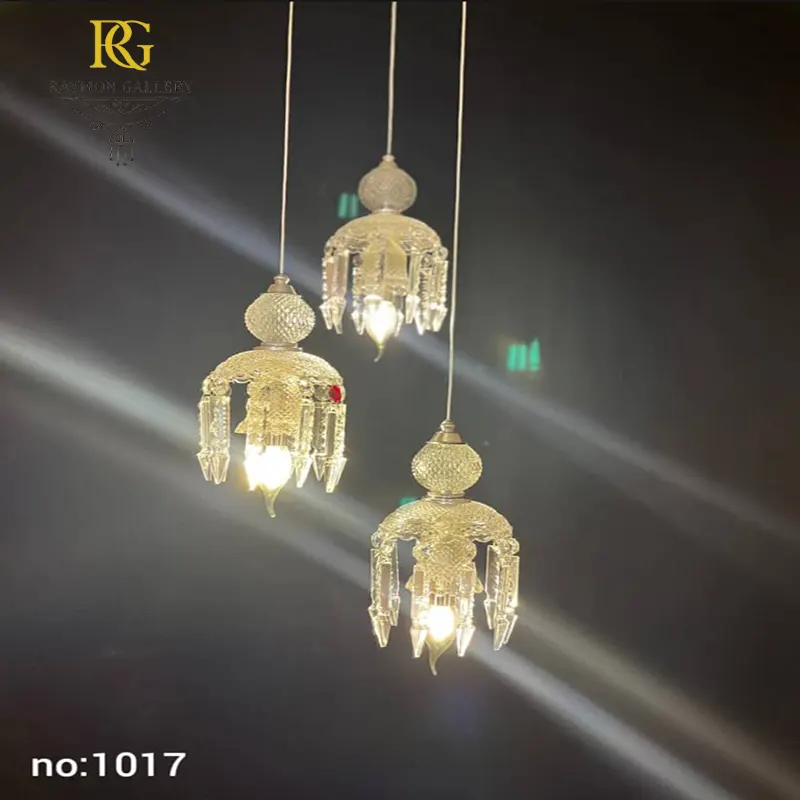 هر آویز دارای طراحی گنبدی و کروی حکاکیشده است که با آویزهای اشکی و منشوری کشیده تزئین شده و نور لامپ از داخل آن عبور میکند. بازی نور و انعکاس کریستالها، فضایی مجلل و گرم ایجاد میکند و توجه هر بینندهای را به خود جلب میکند. طراحی سه شاخه با ارتفاعهای متفاوت، باعث ایجاد عمق بصری و حرکت نور در محیط میشود، بهخصوص در سقفهای بلند و فضاهای لوکس و معاصر.