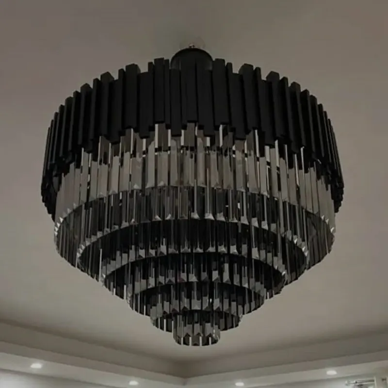 لوستر آویز مدرن مشکی کریستالی مدل پیانویی با طراحی لایهلایه و الهامگرفته از کلیدهای پیانو، انتخابی خاص برای دکوراسیونهای مدرن و لاکچری است. ترکیب بدنه مشکی مات با کریستالهای شفاف عمودی، جلوهای قدرتمند، عمیق و بسیار چشمگیر ایجاد میکند.