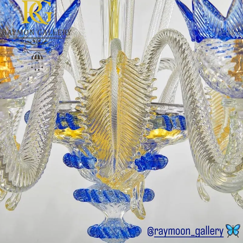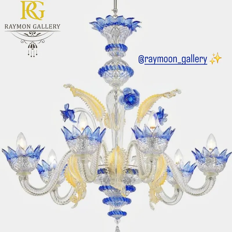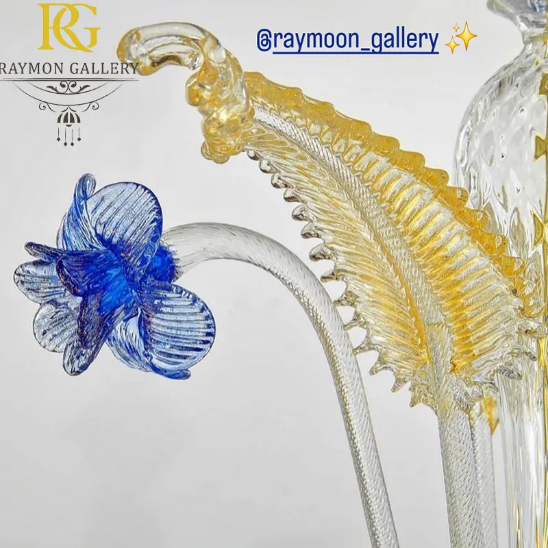 لوستر مورانو آبی طلایی با شاخههای گلبرگی کریستالی، نمونهای از هنر دستساز و طراحی لوکس است که جلوهای خاص و متفاوت به فضای داخلی شما میبخشد. ترکیب رنگ آبی و طلایی، نور را به زیبایی منعکس کرده و فضایی گرم و چشمنواز در پذیرایی، سالن یا لابی شما ایجاد میکند.