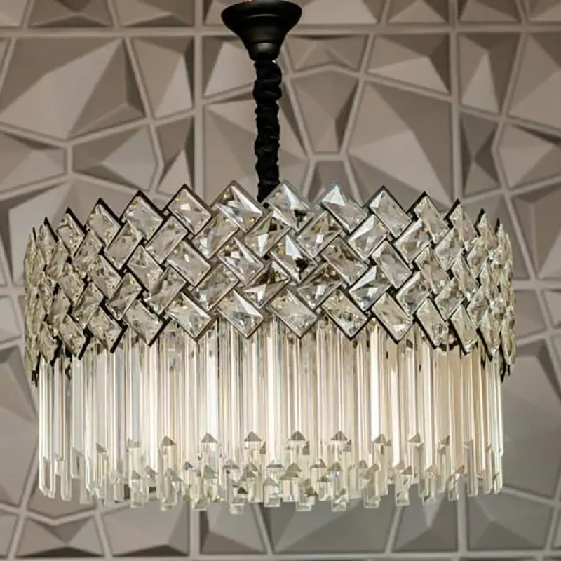 بدنه بالایی لوستر از کریستالهای لوزی تراشخورده تشکیل شده که بهصورت ردیفی و منظم در کنار یکدیگر قرار گرفتهاند. این طراحی باعث شکست چندمرحلهای نور و ایجاد درخشش الماسگونه در فضا میشود. فریم فلزی مقاوم با رنگ تیره، کنتراست زیبایی با شفافیت کریستالها ایجاد کرده و جلوهای کاملاً مدرن و لوکس به لوستر میدهد.