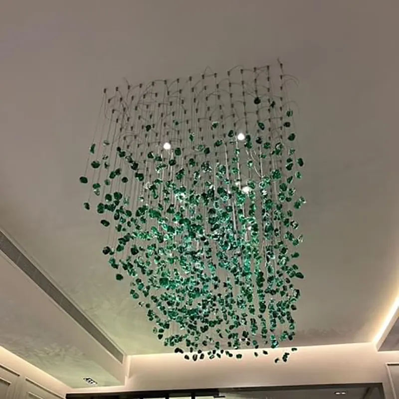 لوستر قلوه سنگ سبز رنگ با طراحی الهامگرفته از سنگهای طبیعی و رودخانهای، ترکیبی از هنر، طبیعت و نورپردازی مدرن را ارائه میدهد. فرم نرم و ارگانیک قلوهسنگها در کنار رنگ سبز ملایم، حس آرامش، تعادل و ارتباط با طبیعت را به فضای داخلی منتقل میکند.
