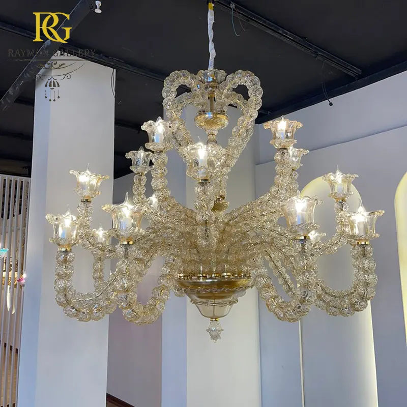 درخشش طلایی این لوستر دستساز مورانو، فراتر از نور است؛ نمایشی از مهارت شیشهگران ونیزی که از تودههای شفاف شیشه، فرمی زنده و سیال آفریدهاند. ساختار طبقاتی شاخهها با انحنایی دقیق، یادآور جریان نور میان پردههای طلایی غروب بر سطح کانالهای ونیز است.