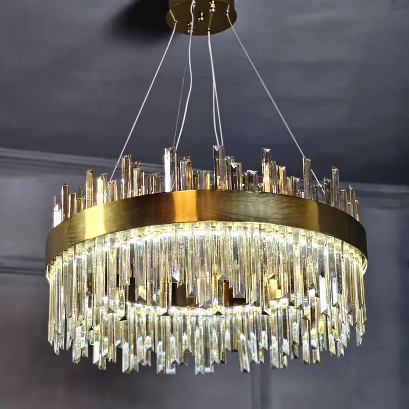 کریستال‌های شفاف با برش‌های دقیق، نور را به‌صورت یکنواخت و درخشان در فضا پخش می‌کنند و در ترکیب با فریم طلایی براق، حس گرما و تجمل را به محیط می‌بخشند. چیدمان لایه‌لایه کریستال‌ها عمق بصری ایجاد کرده و حتی در حالت خاموش نیز جلوه‌ای دکوراتیو و جذاب دارد.