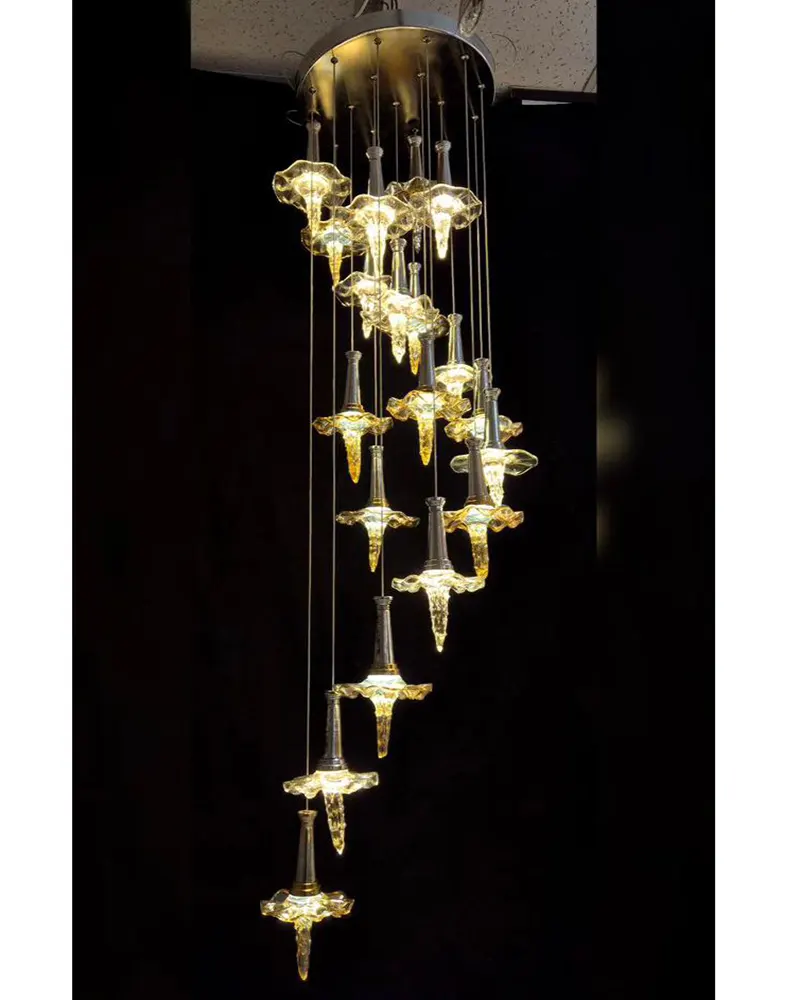لوستر آویزی مدرن ریزشی طرح گل، جلوهای از زیبایی طبیعت را با طراحی معاصر در هم آمیخته است. این لوستر با آویزهای متعدد که به شکل گلهای ظریف طراحی شدهاند و به صورت آبشاری فرو میریزند، فضایی شاعرانه و دلانگیز خلق میکند. جنس کریستالی یا بلوری گلها، نور را به زیبایی پراکنده کرده و درخششی ملایم و چشمنواز به محیط میبخشد. مناسب برای ورودیها، راهروهای بلند، بالای میز ناهارخوری یا فضاهای نشیمن با سقف بلند که نیاز به یک عنصر بصری قدرتمند دارند.
