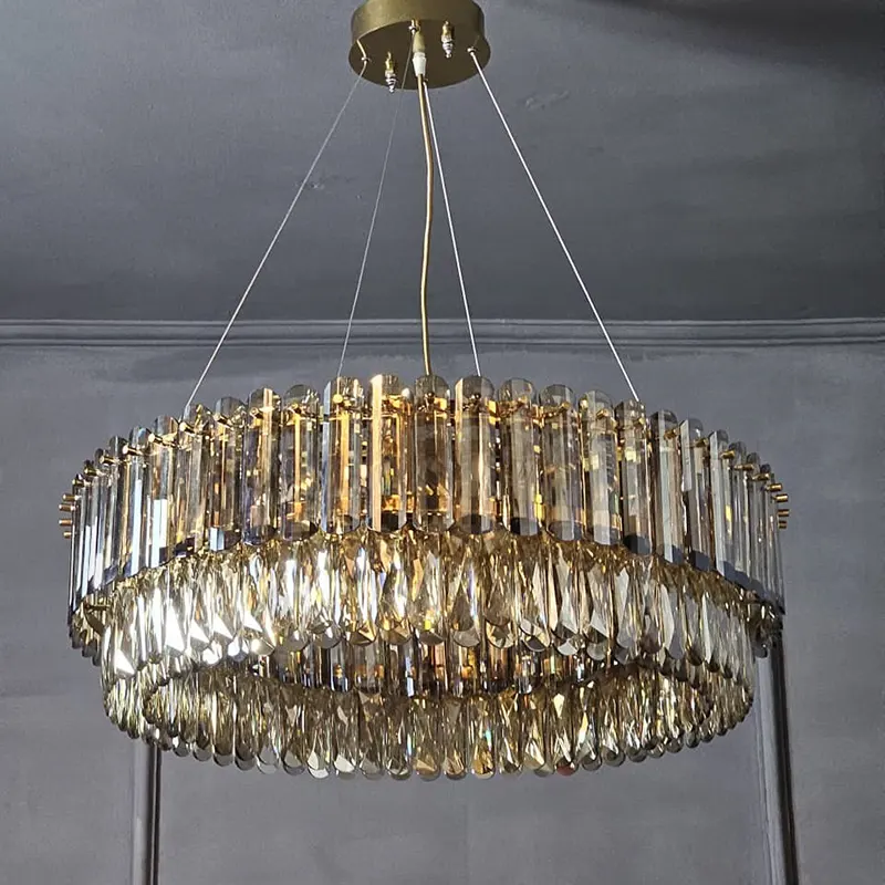 در این مدل، بدنه بهصورت کامل از کریستالهای شفاف و خوشتراش ساخته شده که در چند ردیف منظم کنار هم قرار گرفتهاند. این چیدمان باعث انعکاس نور از زوایای مختلف شده و نوری درخشان، یکنواخت و بسیار چشمنواز در فضا ایجاد میکند. ترکیب کریستالهای کشیده در بخش بالایی و کریستالهای آویز در قسمت پایینی، عمق بصری فوقالعادهای به لوستر میدهد و آن را به نقطه کانونی دکوراسیون تبدیل میکند.
