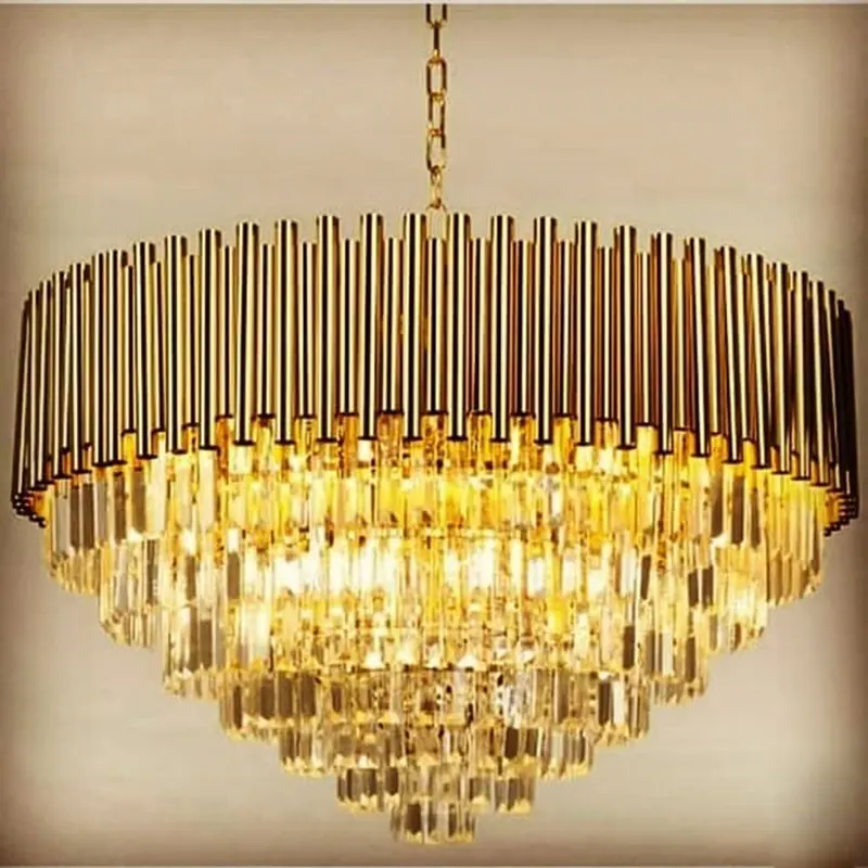 در این مدل، بدنه فلزی با طراحی لوله‌ای عمودی به‌صورت منظم در کنار کریستال‌های آویز شفاف و خوش‌تراش قرار گرفته است. کریستال‌ها با انعکاس چندبعدی نور، درخششی گرم و لوکس ایجاد کرده و فضا را به‌طرز چشمگیری روشن و مجلل می‌کنند. فرم پلکانی کریستال‌ها در بخش زیرین، باعث ایجاد عمق بصری و زیبایی دوچندان شده است.