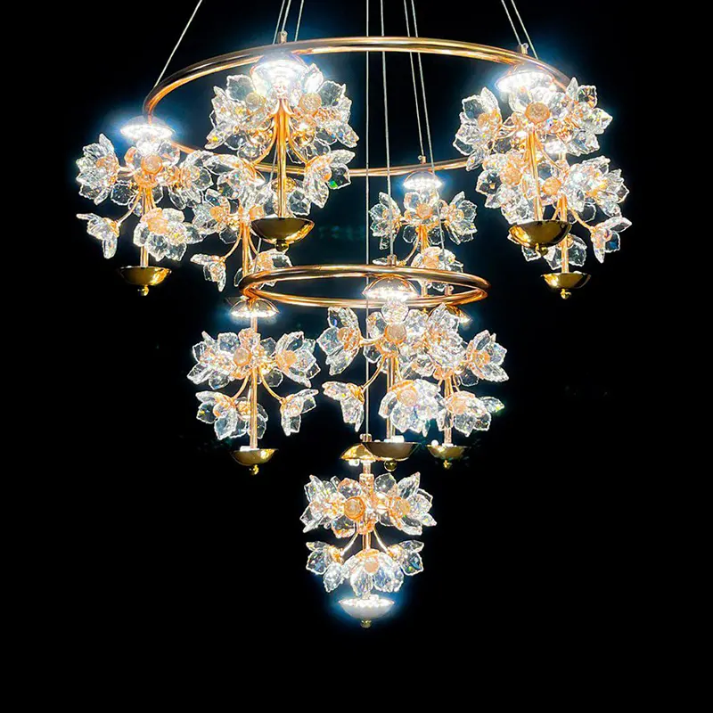 لوستر سقفی چند شاخه طلایی با آویزهای گل کریستالی، نمادی از شکوه و جلوه هنر در طراحی داخلی است. بدنه طلایی براق در ترکیب با آویزهای کریستالی به شکل گل، نوری مجلل و خیرهکننده را در فضا میپراکند. این مدل با قابلیت ساخت سفارشی در ابعاد، تعداد شاخهها، رنگ آبکاری و نوع کریستال، انتخابی بینظیر برای سالن پذیرایی، تالارها و فضاهای کلاسیک یا نئوکلاسیک است که به دنبال تجمل و زیبایی ماندگار هستند.