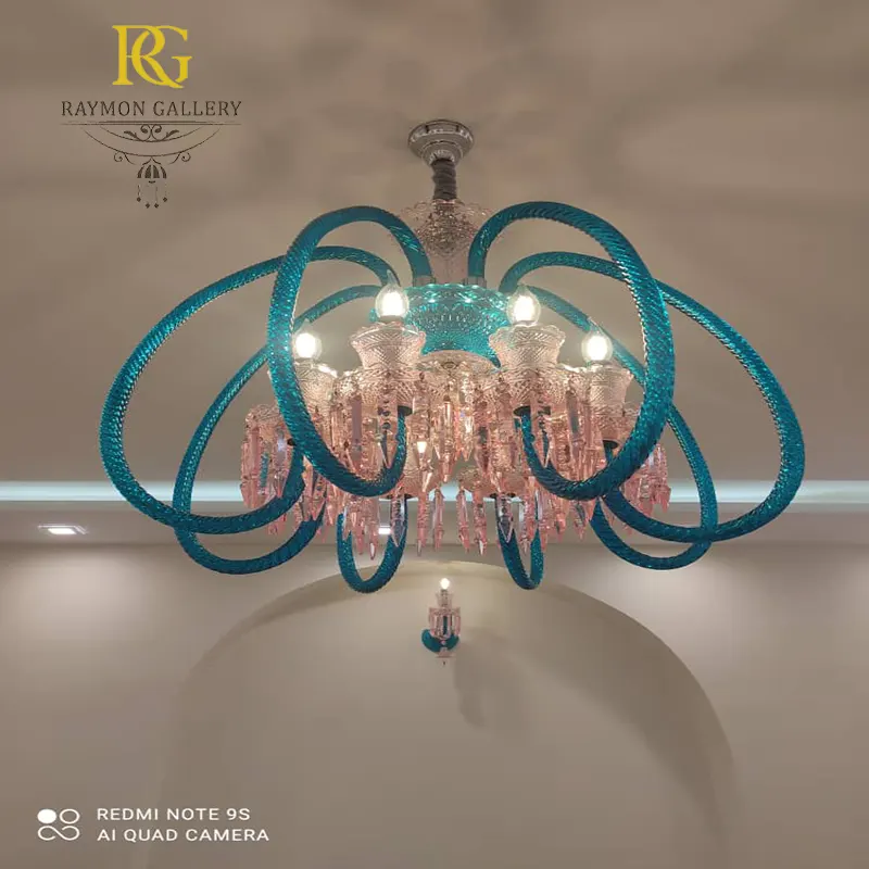 با امکان سفارشیسازی رنگ شاخهها، ارتفاع لوستر و اندازه کریستالها، این مدل میتواند به طور کامل با سبک و متراژ فضای شما هماهنگ شود. ترکیب صورتی و آبی باعث میشود لوستر در کنار مبلمان ساده یا دکوراسیون مدرن و مینیمال، نقطه کانونی جذابی در محیط ایجاد کند.